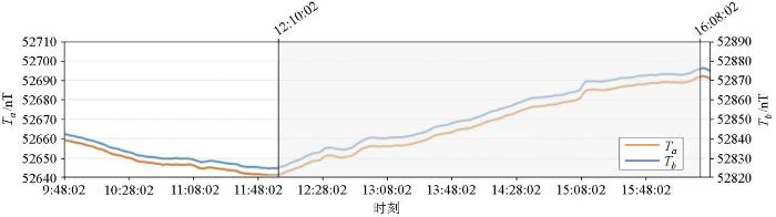 2024年11月1日开展了磁异常背景站和侯家庄异常站的磁场测量,结果(图6)显示,时间从12:10:02到16:08:02,地磁场强度持续增加,背景站的磁场值从52 828.33 nT增加到了52 872.76 nT,增幅达44.43 nT。背景站和异常站的磁场曲线较光滑、变化趋势一致,表明背景站和异常站的磁场变化规律基本一致,数据中噪声较小。