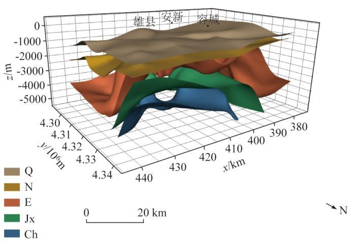 地表被第四系地层所覆盖,呈现向东增厚的趋势,沉积厚度约200~600 m。新近系地层在研究区均有分布,底面自NW向SE埋深逐渐加大,呈北薄南厚的特征,沉积厚度400~800 m。古近系地层的厚度变化显著,从数百米至数千米不等,呈现出极大的差异性。在徐水凹陷、霸县凹陷内沉积厚度巨大,容城凸起和牛驼镇凸起上遭受不同程度的剥蚀,古近系地层的分布整体上受控于区域性构造活动,分别与上覆新近系和下伏蓟县系地层呈不整合接触。蓟县系地层受断层影响,埋深在研究区内变化较大,尤其在凸起部位由于强烈的剥蚀作用而明显减薄,造成地层局部缺失。长城系和太古界地层在研究区5 km深度范围内出露较少,在容城凸起和牛驼镇凸起埋深较浅,由于断层活动作用对地层的强烈改造作用,厚度自SW向NE逐渐增加。
