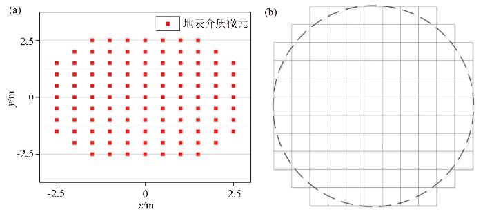 式中:hi为地表微元i与探测器所在平面的高度差;Li为地表介质微元i与探测器在地面投影点的水平距离;a为采用起伏地形网格划分的小正方形边长;n为有限元的个数。