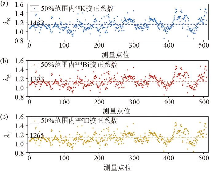Terrain correction coefficients for the 40K (1 460 keV) (a), 214Bi (1 764 keV) (b), and 208Tl (2 614 keV) (c) energy windows of UAV-borne gamma-ray spectrometry at each sampling point