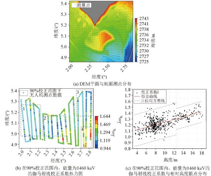 图7是测区DEM平面与地面测点分布、测区40K(1 460 keV)在90%校正范围内地形校正系数λ热力图及与相对高度的散点图。