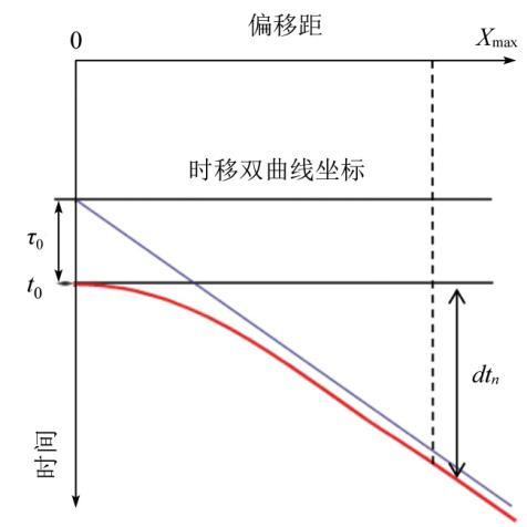 基于以上理论,采用由Siliqi等[15 -16 ] 提出的高密度双谱速度拾取方法,通过参数化非双曲线的时差,将常规的二维速度谱转换为三维的速度谱(t 0 ,dtn ,τ 0 )进行拾取,获得密度和精度更高的速度体。其具体实现是将式(5)中常规时移校正的参数椭圆率η 和V NMO 转换为描述各向异性的时移参数的零偏移距走时τ 0 和最大偏移距下的剩余时差dtn ,参数关系如图1 所示,可知当τ 0 =t 0 / (1+8η )时,dtn =tx =X max -tx =0 ,相应的式(5)可转换为: