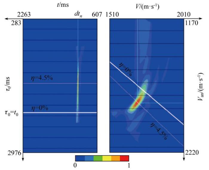图2 是高密度双谱速度分析,是基于V 和η 参数与τ 0 和dtn 参数的非双曲线动校式(5)和式(6)形成的双谱面板左(dtn ,τ 0 )和右(V ,V an ),其中dtn 为剩余时差、τ 0 为零偏移距走时、V 为NMO速度、V an 为各向异性速度,面板上的颜色表示Semblance值(无量纲,范围 0~1),颜色越亮(红)表示相似性越高,参数组合更可靠。在拾取(dtn , τ 0 )面板中相应的dtn ,τ 0 参数后再转换到(V ,V an )面板中获取相应的V 和η 参数。从图2 中可以看出左图中(dtn ,τ 0 )面板高semblance区域(亮色)集中在一个狭窄范围内,比(V ,V an )面板具有更好的约束性,表明dtn 和τ 0 的解更稳定,τ 0 的变化被限制在表面最大值附近的一个小区域内(即颜色最亮区域对应的纵轴范围)。