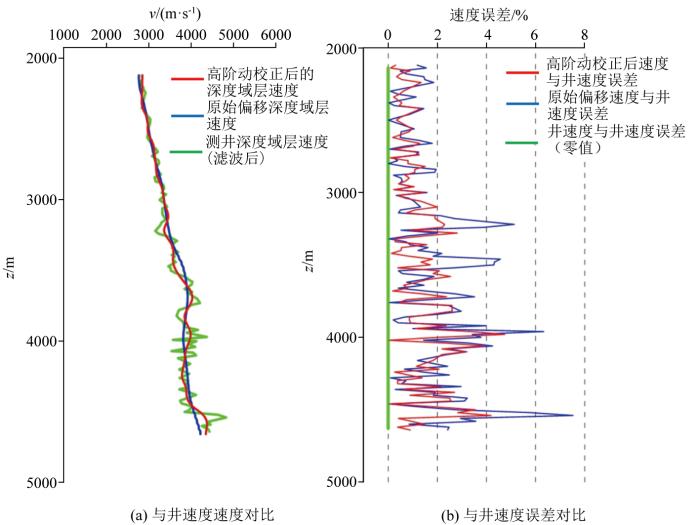 为了验证高阶动校正得到的地震速度体的准确性,采用新的地震速度对原始反动校正后的CRP地震道集进行动校正拉平。图6 是经过高阶动校正处理前后的道集对比,可以看出双参数高阶算法处理后的道集在大偏移距可以得到进一步的拉平,提高CRP地震道集质量,初步证明了高阶动校正得到的地震速度体的准确性。之后将声波测井速度、原始地震偏移速度以及高阶动校正后的新速度进行对比分析,如图7 与井速度对比。可以看出高阶动校正后的新速度与声波测井速度更加匹配;从图7b 所示的与井速度误差对比可以看出,高阶动校正后的新速度与测井声波速度的误差整体上低于原始地震偏移速度与测井声波速度的误差,因此,可以证明高阶动校正后的新速度是准确的,并且相比原始地震偏移速度具有更高的精度。
