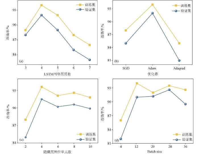 SMOTE-LSTM模型训练集、验证集准确率随(a)LSTM网络层层数、(b)优化器种类、(c)隐藏层神经单元数、(d)Batch size参数变化趋势