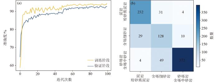在模型训练过程中,随着迭代次数的增加模型性能显著提升。具体而言,训练、验证阶段的准确率分别可达到94%、92%(图4),且曲线趋势基本一致,模型不存在过拟合现象,模型损失函数值最终稳定在0.5以下,数据指标充分展示模型的卓越鲁棒性,预测结果与实际岩性数据高度吻合。