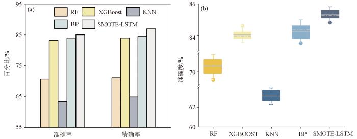 岩性识别算法模型准确率、精确率对比(a)和对比模型十折交叉验证结果(b)