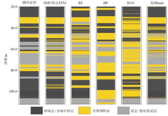 结果显示(图6)SMOTE-LSTM模型预测准确率显著优于KNN和RF模型,分别存在25.6%、17.4%的差异,主要在于KNN和RF模型在区分泥岩和含砾细砂岩方面存在较多误判,基于薄层岩性识别,RF和KNN模型同样出现较多误差;相较于XGBoost和BP模型,SMOTE-LSTM模型虽然准确率优势不太明显,但在预测精确度方面表现出显著优势,分别提升了4.6%、3.4%,原因在于XGBOOST和BP模型在某些薄层岩性的识别上存在预测盲区,而SMOTE-LSTM模型通过时序门控机制实现对测井垂向数据前后关联性的控制。