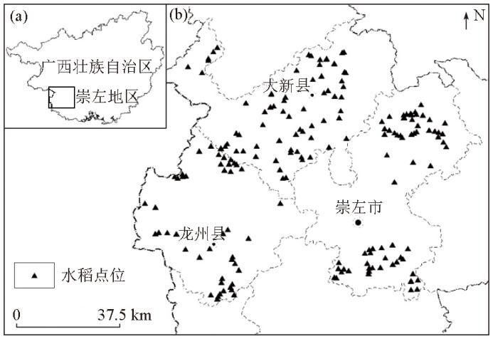 研究区位于广西壮族自治区西南部(东经106°34'59~107°37'11,北纬22°10'04~22°58'02),毗邻越南,涵盖崇左市江州区、大新县、龙州县3县区,为主要粮食作物产区。地层包括泥盆系、石炭系、侏罗系、三叠系、第四系及侵入岩。成土母质以碳酸盐岩为主,非碳酸盐岩区面积较小。地貌多溶蚀小平原和圆洼地、槽谷地,丘陵起伏,山多地少,为典型的喀斯特岩溶地貌区。全年光照充足,夏长冬短,雨量充沛,干湿季节分明,具有明显的南亚热带季风气候特点。