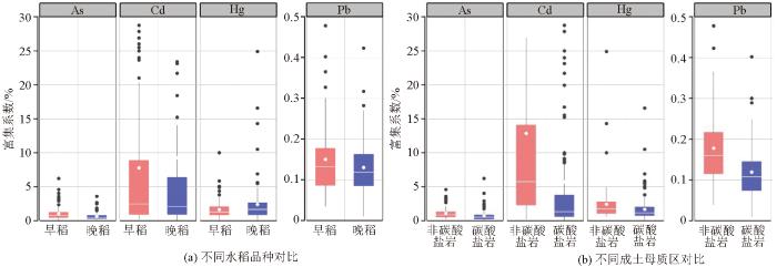 针对不同水稻品种、水稻种植区成土母质分别开展非参数检验。曼—惠特尼检验(Mann-Whitney U test)结果表明,早、晚稻籽实中Cd、Pb含量总体差异较小,As、Hg含量总体分布则存在显著差异,早、晚稻As含量均值分别为0.12×10-6、0.082×10-6,Hg含量均值分别为0.003 2×10-6、0.041 5×10-6。克鲁斯卡尔—沃利斯检验(Kruskal-Wallis test)结果表明,不同成土母质背景的水稻重金属含量均存在显著差异。非碳酸盐岩区水稻重金属含量普遍较高,As、Cd、Hg、Pb均值分别为0.135×10-6、0.054 ×10-6、0.006×10-6、0.064×10-6;碳酸盐岩区水稻重金属含量均值分别为0.104×10-6、0.043×10-6、0.004 ×10-6、0.051×10-6。