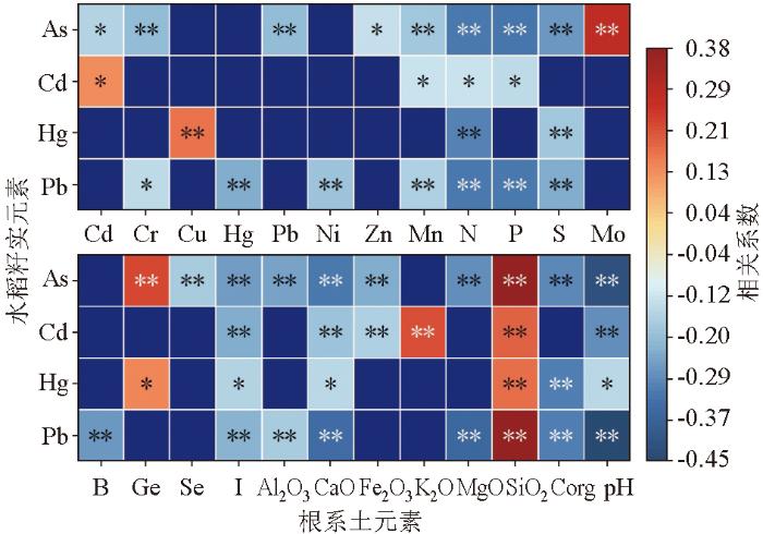 崇左地区水稻籽实中As、Pb含量与根系土壤中金属、非金属元素及氧化物均表现出明显的相关性,以负相关为主;而Cd、Hg则主要与根系土壤中氧化物表现出显著的相关性特征。