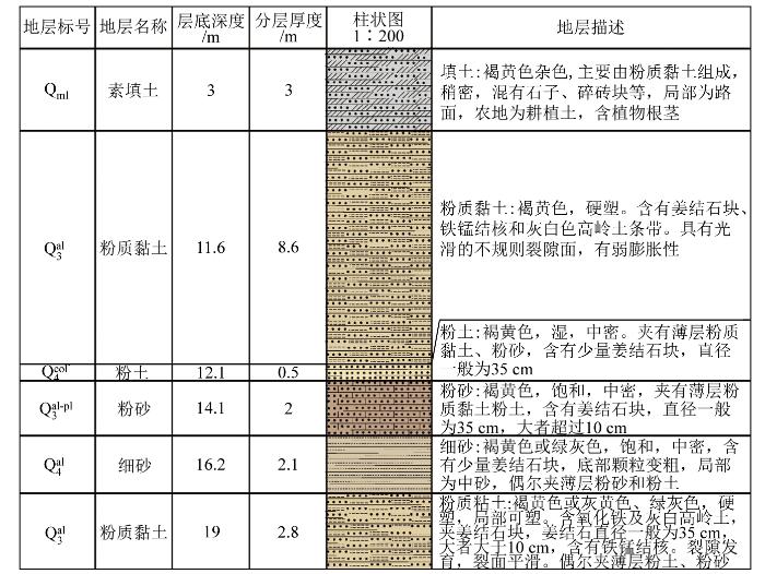 进一步搜集该工程场地的钻孔资料,钻孔位置位于测线sw3附近(图1)。钻孔岩芯(图3)显示,埋深20 m以上岩层为素填土、粉质黏土、粉土、粉砂、细砂、粉质黏土。从探地雷达结果可以看出,埋深3 m处有强反射同相轴,以上应为素填土层,3 m以下应为粉质黏土层。从多通道瞬态面波剖面可明显分出三层,分别为低速层0~5 m、中速层5~15 m和高速层15~20 m,分别对应素填土、粉质黏土、砂岩层。从电阻率剖面中可清晰看出,埋深0~3 m的高阻为素填土层,3 m以下由于被渗漏的地下水侵蚀,分层不明显。所有剖面图均可看出渗漏点位位于埋深3~12 m的粉质黏土层内。通过查阅该地区工程水文地质报告,得知该层渗透系数为3.758 3 m·d-1,属于低渗透土壤。地下水从伸缩缝中渗漏主要是由自身重力引起,渗漏压力不大。这进一步验证了电阻率剖面中管道低阻区异常为管道底部渗漏引起。