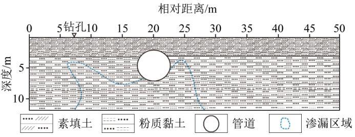 综上所述,从探地雷达结果得知,管道顶端埋深在2 m左右,从多通道瞬态面波推测管道直径在5 m 左右,即管道底部埋深在7 m左右(图4)。管道埋于素填土与粉质黏土之间。从电阻率剖面图可看出漏水位置应在管道底部7 m左右,并在管道下部形成底部渗漏造成的渗漏区域,这与前面的勘探结果相互验证。
