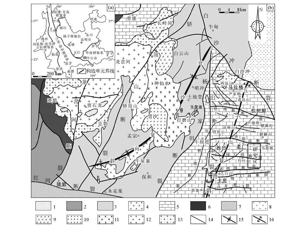 | 图1 云南个旧地区大地构造位置(a)及矿区地质简图(b)(据毛景文等[ 1—第四系;2—火把冲组板岩、砂岩、砂砾岩;3—法郎组砂岩、页岩夹凝灰岩和玄武质熔岩;4—法郎组玄武质熔岩;5—个旧组碳酸盐岩;6—下三叠统紫红色砂岩夹绿色砂岩、泥灰岩;7—哀牢山变质带;8—辉长岩;9—霞石正岩;10—碱长花岗岩;11—碱性花岗岩;12—斑状黑云母花岗岩;13—等粒黑云母花岗岩;14—断裂;15—向斜;16—背斜 |
