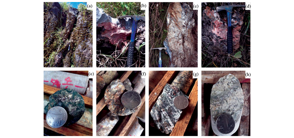 | 图8 个旧老厂矿田东部野外及岩心照片 a—构造破碎带角砾岩;b—褐铁矿化;c—网脉状、细脉状方解石脉;d—褐铁矿化碎裂岩;e—含矿矽卡岩;f—矽卡岩硫化矿石;g—透辉石矽卡岩;h—绿泥石化大理岩 |