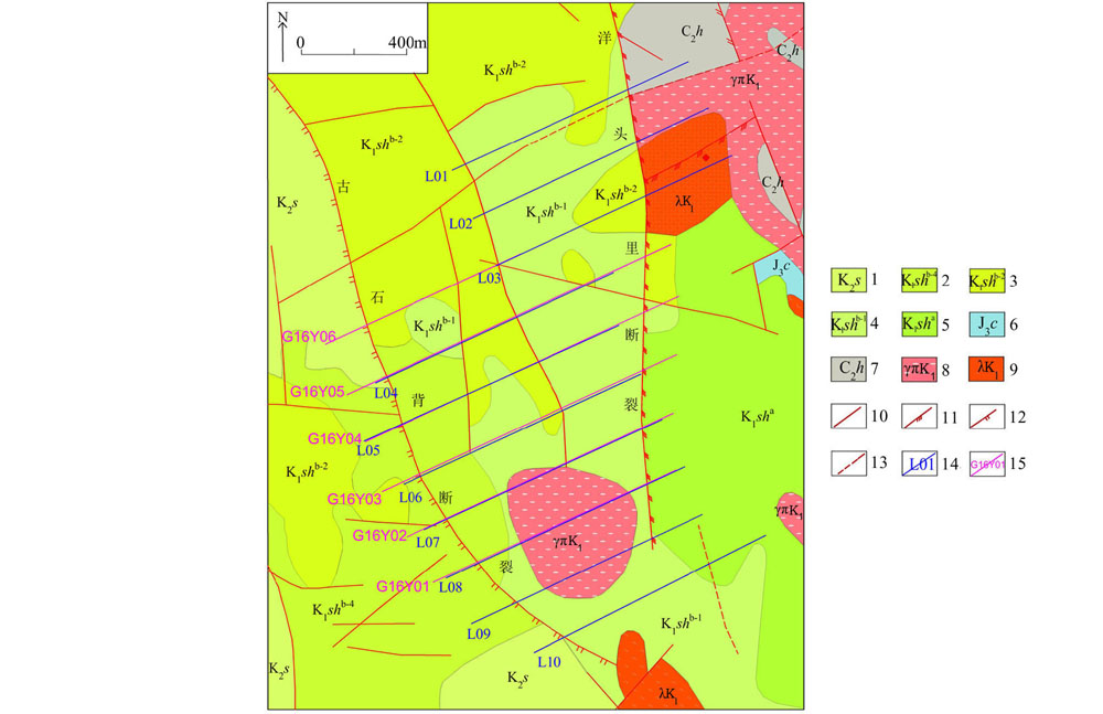 | Fig.1 Geological and survey line layout of the study area 1—upper Cretaceous; 2—lower Cretaceous fine-grained rhyolite; 3—lower Cretaceous biotite rhyolite; 4—lower Cretaceous tuffaceous sandstone; 5—lower Cretaceous andesite; 6—upper Jurassic dolomitic limestone; 7—upper Carboniferous sandstone conglomerate; 8—yanshanian granite porphyry; 9—yanshanian sub rhyolite; 10—measured fault; 11—compression torsion fault; 12—tensile fault; 13—inferred fault; 14—ground gamma energy spectrum, soil radon line and its number; 15—AMT line and its number |