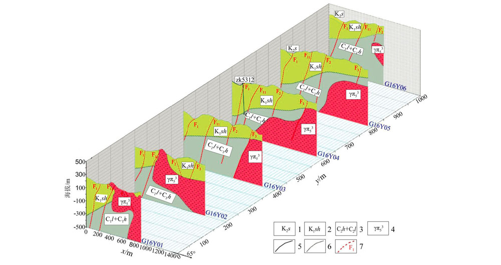 | Fig.7 Comprehensive diagram of geological inference and interpretation in ancient Shibei area 1—Shaxian formation: calcareous mudstone, siltstone, glutenite; 2—Shimaoshan group: rhyolite, tuffaceous sandstone, dacite, andesite, etc.; 3—Huanglong formation: gray white dolomitic limestone, siliceous rock+Woodland formation: Quartz conglomerate, glutenite, coarse sandstone with siltstone, shale; 4—granite porphyry; 5—inferred unconformity contact boundary; 6—inferred lithology contact boundary; 7—inferred fault and number |