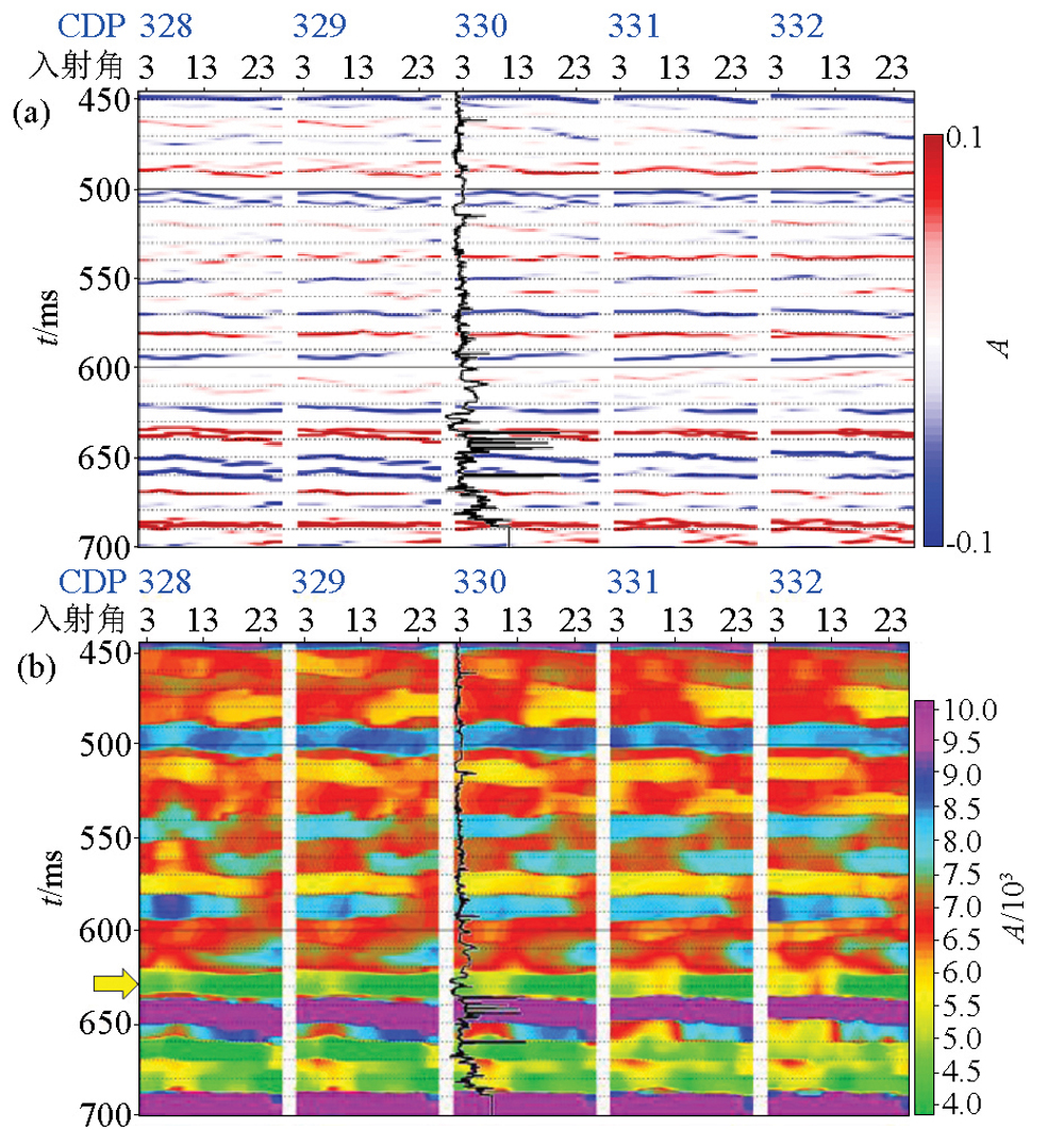 | 图10 基追踪弹性反演结果 a—基追踪弹性反演反射系数剖面;b—基追踪弹性阻抗剖面 |