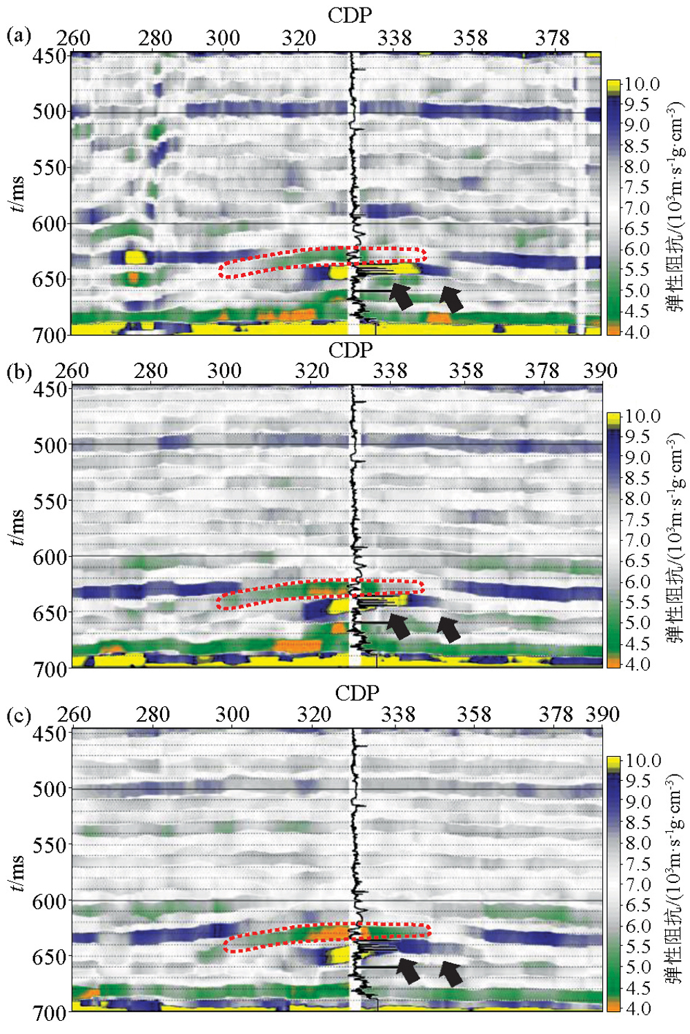 | 图12 不同入射角的弹性阻抗剖面 a—3°弹性阻抗剖面;b—16°弹性阻抗剖面;c—26°弹性阻抗剖面 |