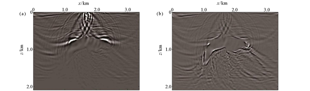 | 图10 二维SEG/EAGE盐丘模型的第57炮VSP数据逆时偏移结果 a—零延迟互相关成像条件;b—震源归一化零延迟互相关成像条件 |
