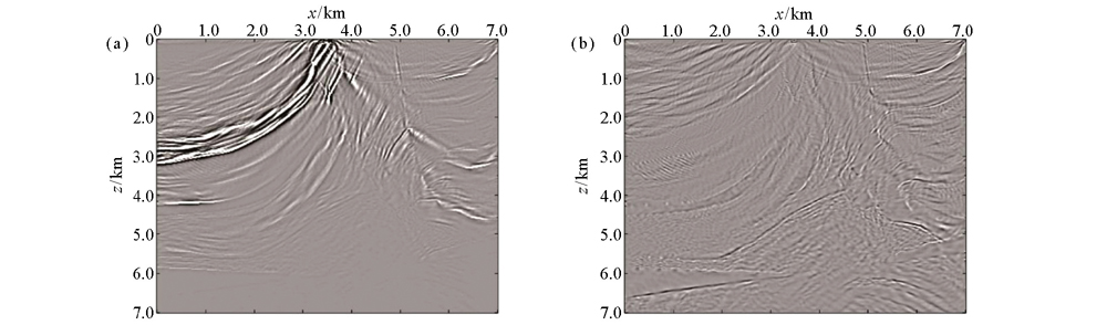 | 图14 Marmousi模型的第59炮VSP数据逆时偏移结果 a—零延迟互相关成像条件;b—震源归一化零延迟互相关成像条件 |