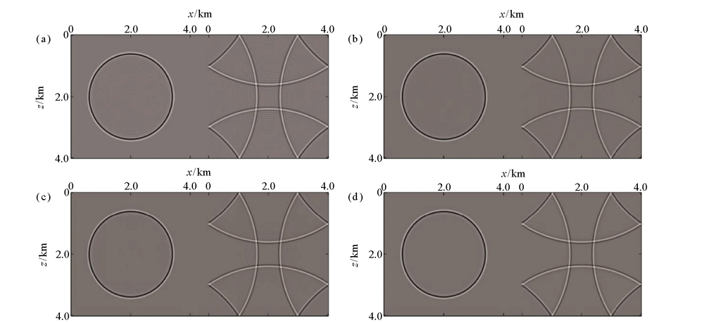 | 图3 不同差分算子长度时交错网格有限差分法在不同时刻的波场快照 a—传统交错网格有限差分法,M=5;b—优化交错网格有限差分法,M=5;c—传统交错网格有限差分法,M=10;d—优化交错网格有限差分法,M=10;从左至右依次为1 s和2.5 s |