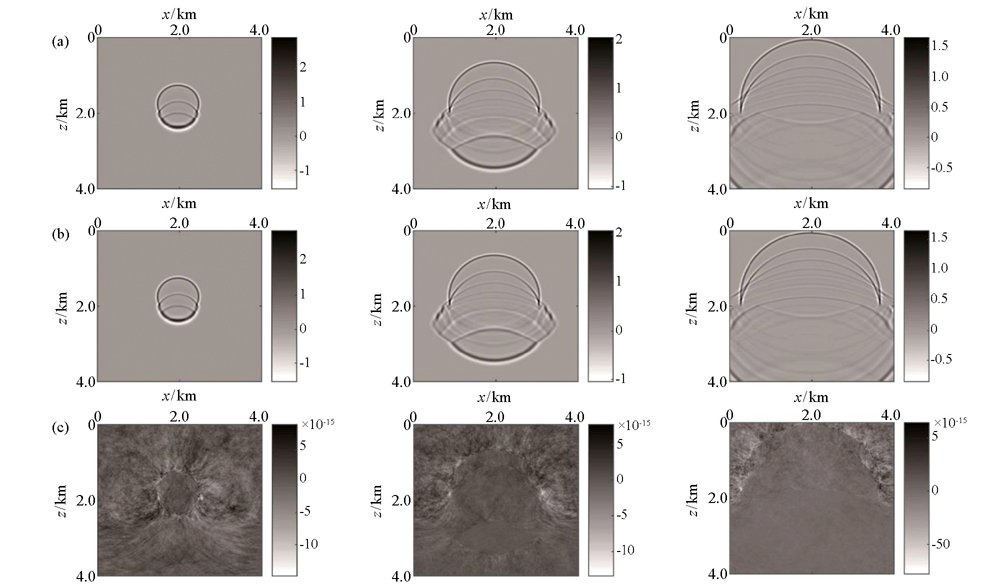| 图8 多层层状模型在不同时刻的波场快照 a—正传波场;b—重构波场;c—正传波场和重构波场之间的差异;从左至右依次为0.4、0.8、1.2 s时刻 |