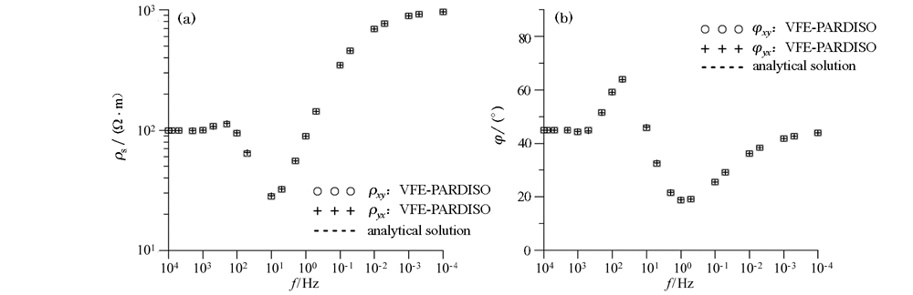| 图4 H型层状模型三维正演视电阻率(a)和相位(b)数值解与解析解对比 |