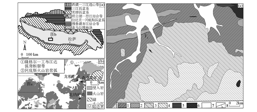 | 图2 冈底斯区域构造位置图(a)[ 1—上石炭-下二叠统拉嘎组地层(C2P1l);2—下二叠统昂杰组地层(P1a);3—古新统典中组火山地层(E1d);4—始新统年波组火山地层(E2n);5—上白垩统江巴组火山地层(K2jb);6—侵入体;7—第四系冲洪积物(Q);8—堆驾拉逆断层 |