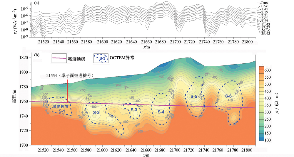 | 图4 OCTEM感应电压剖面(a)及反演电阻率断面解释成果(b) |