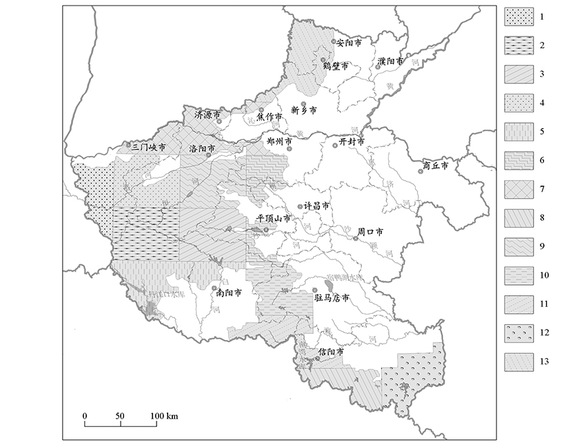 | 图1 河南省1∶20万水系沉积物测量工作程度 1—商南幅、洛南幅区域地球化学调查;2—栾川幅区域地球化学调查;3—鲁山幅区域地球化学调查;4—洛宁幅区域地球化学调查;5—内乡-南阳一带区域地球化学调查;6—平顶山幅、许昌幅区域地球化学调查;7—三门峡幅、洛阳幅、郑州幅区域地球化学调查;8—新县幅区域地球化学调查;9—临汝幅区域地球化学调查;10—泌阳幅区域地球化学调查;11—桐柏幅、信阳幅区域地球化学调查;12—固始幅、商城幅区域地球化学调查;13—长治幅、邯郸幅、陵川幅、鹤壁幅(部分)区域地球化学调查 |