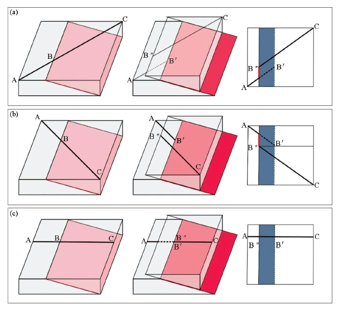 | Fig.4 Fault effect caused by oblique fault a、b—if the fault strike is inconsistent with formation strike, then when the marker layers or structural lines on both sides of the fault are projected onto a certain surface, they will show horizontal shift, giving the illusion of left-lateral strike-slip or right-lateral strike-slip on the plane;c—if the fault strike is inconsistent with formation strike, then there is no visual error when the break point is projected onto the same plane |