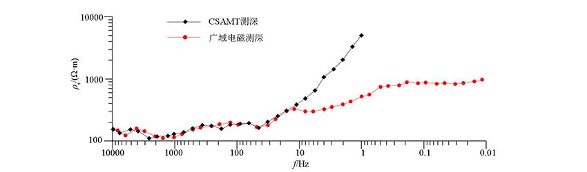 | 图4 13200号点广域电磁测深与CSAMT测深视电阻率对比 |