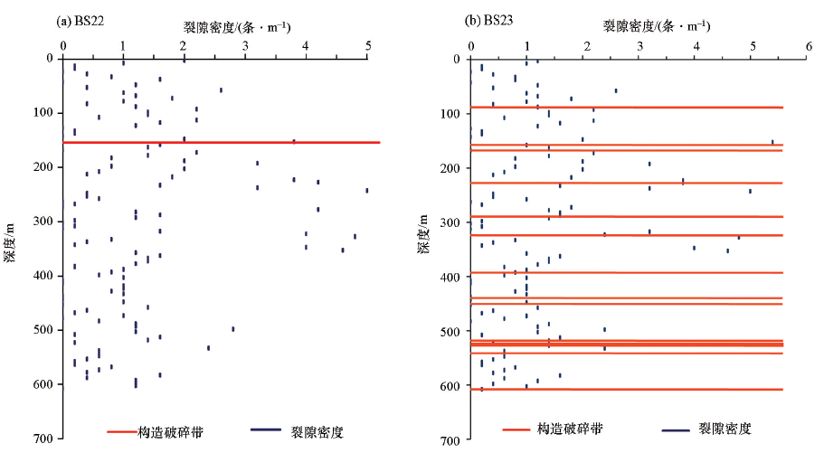 | 图4 BS22、BS23钻孔岩心裂隙发育程度随深度的变化 |