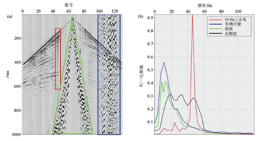 | 图3 单炮记录上的噪声(a)和对应的频谱(b) |
