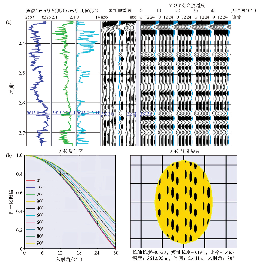 | 图3 YD301井目的层段各向异性特征正演 a—YD301井各向异性正演模拟结果;b—YD301井目的层3612.95 m处方位各向异性特征分析 |