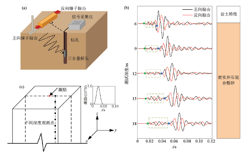 | 图1 地表水平正反敲击下孔法S波波速测试 a—地表水平敲击下孔法波速测试示意;b—北京某场地正反向地表水平敲击下孔法S波波速测试获得的记录波形;c—地表水平激振下孔法S波波速测试三维分析模型 |