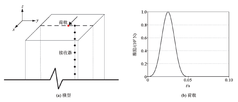 | 图2 地表水平激振下孔法S波波速测试三维分析模型(a)及荷载(b) |