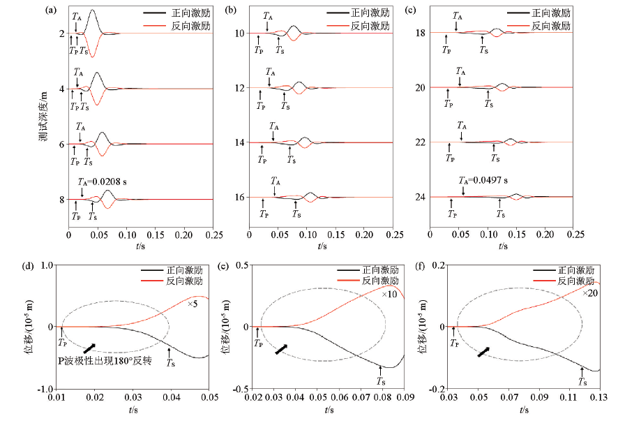 | Fig.3 Signal traces at different depth observation points in x-direction under the horizontal forward and backward excitation a、b、c—the original signal traces at different selected depth;d、e、f—amplified waveform of partially signals at observation points with depth of 8 m,16 m,24 m |