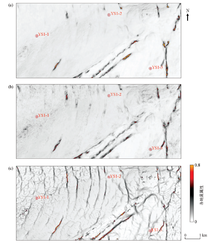 | 图3 YS1井区地震属性沿层切片 a—方差体切片;b—最大曲率切片;c—混沌体切片 |