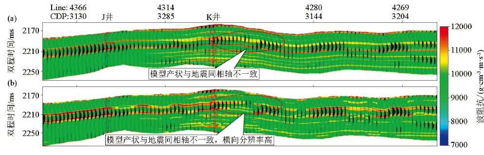 | 图11 不同建模方法的初始模型对比 a—常规井间插值建模;b—分频构形建模 |