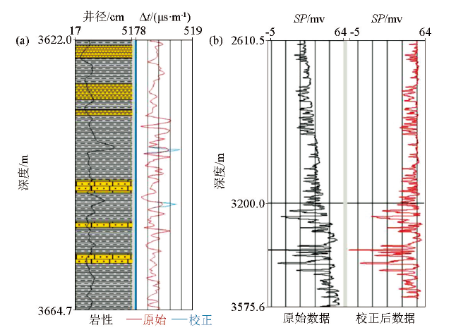 | 图6 测井曲线校正 a—声波环境校正;b—自然电位泥岩基线校正 |