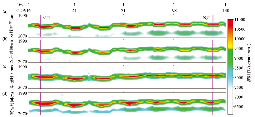 | Fig.9 Comparison of inversion effects of frequency division configuration inversion with different inversion parameters a—waveform comparison time window 15 ms,waveform similarity degree 0.75;b—waveform comparison time window 30 ms, waveform similarity degree 0.9;c—waveform comparison time window 30 ms,waveform similarity degree 0.5;d—waveform comparison time window 30 ms, waveform similarity degree 0.75 |