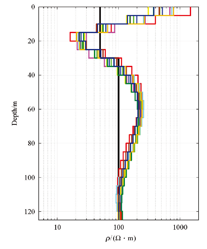 | 图7 随机噪声影响下,实际模型(Tx2发射回线)的反演地电模型 黑色曲线为一维模型,彩色曲线为反演结果 |