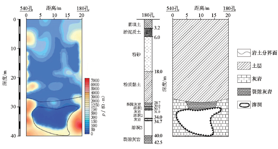 | 图4 540孔~180孔反演电阻率剖面、地层柱状图及地质推断剖面 |
