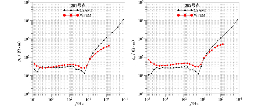 | 图5 381、383号点CSAMT和WFEM视电阻率曲线对比 |