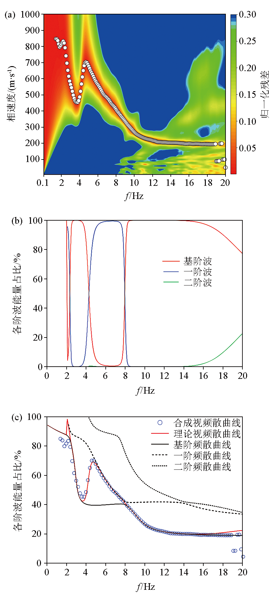 | 图9 含高速硬夹层的地层模型计算的频散曲线 a—合成微动信号的频散曲线;b—各阶瑞利波能量占比;c—频散曲线对比 |