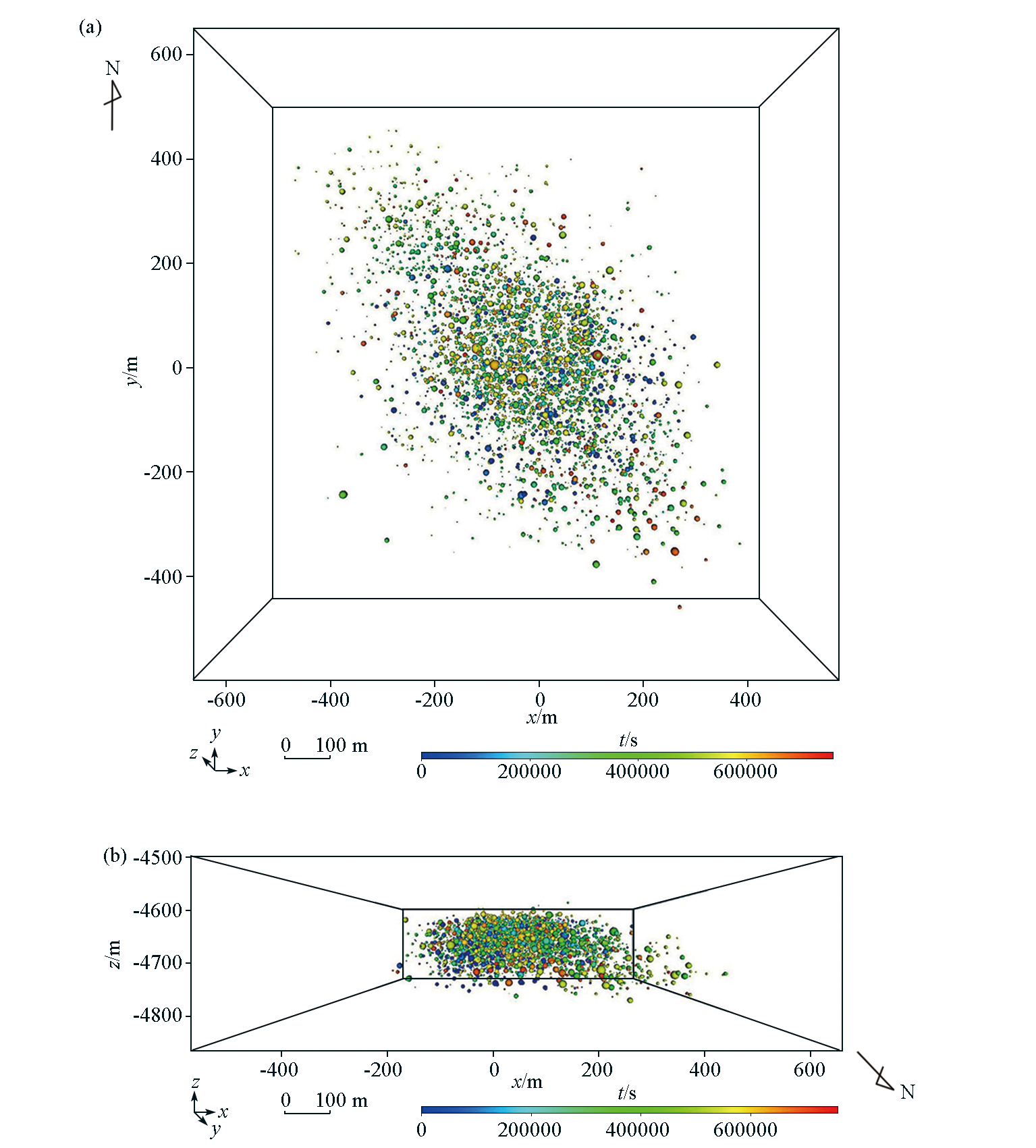 | 图4 微震事件时间—空间分布 a—xy向平面;b—xz向剖面 |