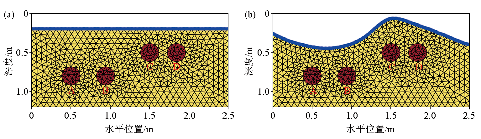 | 图1 不同埋深、不同间距的模型网格示意 a—水平地表;b—起伏地表 |
