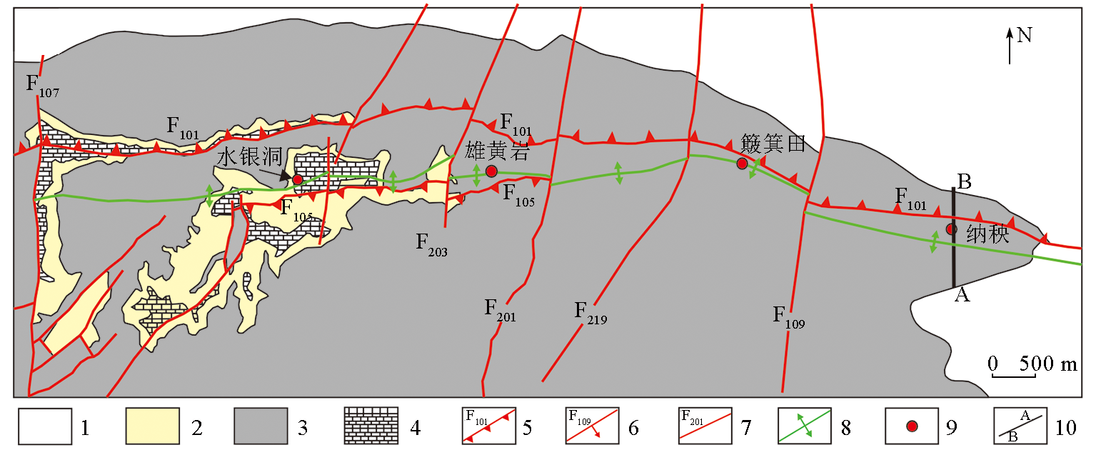 | 图1 水银洞卡林型金矿地质简图(修改自文献[ 1—永宁镇组;2—长兴至大隆组;3—夜郎组;4—龙潭组;5—逆断层及其编号;6—正断层及其编号;7—性质不明断层及其编号;8—灰家堡背斜;9—矿段;10—A-B剖面线 |